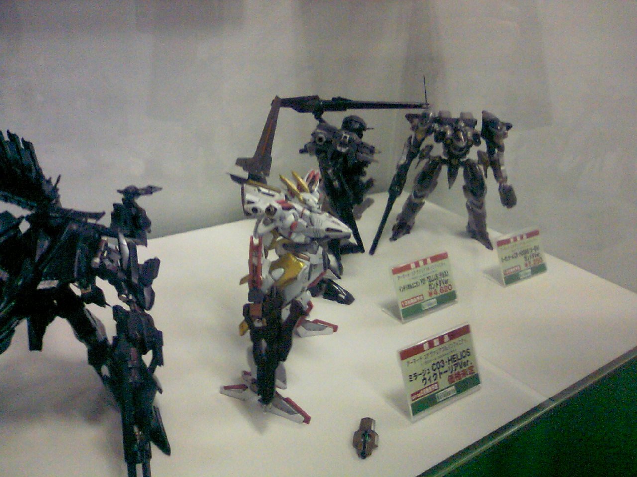 LEGS ZLF-A3/CARM AC2 LEGS LN-D-8000R ACPP BOOSTER B-PT000 ACMOA EXTENSION BEX-AA00 AC2AA ARM UNIT WG-RFM118 ACPP ARM UNIT WG-XP1000 AC ARM UNIT ZWG-AR/K AC2 ARM UNIT KARASAWA-MK2 AC2 ■前作からの復刻追加パーツ パーツ部位 パーツ名(過去シリーズ収録時) 収録シリーズ HEAD HD-H10 ACMOA ARMS ZAN-303/S AC2AA ARMS EAW-S604 AC2 LEGS ELN-070 AC2AA LEGS ZLR-ZIO/MATRIX AC2 RADIATOR RBG-CLX5000 AC2 BACK UNIT ZWC-XP02/QL AC2AA ARM UNIT EWG-HC-GN210 AC2AA ARM UNIT ZWG-HG/111 AC2 ARM UNIT ZLS-T/100 AC2AA ざっとこんなもんですかね 続いてAC3Pの全国決勝大会に行ってきました。 白熱したブレード戦や地道な削り合い、優勝を決した熱暴走。最後の最後まで熱い戦いを見させていただきました。色々あり過ぎて言葉に出来ません(これが物書きを半端に目指す者の発言だろうか?) まぁ、バトルに関してのレポートは他の素晴らしい方々がやってくれていると思うので、物凄くどうでもいい話をしましょうか。 アリーヤ川手さんの顔が凄かった。顔が本当に03-AALIYAHなんですよ、どうやって前を見てるのか分かりません。 戦闘中なんて複眼がオレンジ色だった所為でロックオンカーソルが見えなかったとかw 実用性は皆無でしたが03-AALIYAH頭は格好良かったです、その内グリントさんとか出てきそうですよね?誰か作ってくれ!! ゲスト参戦していたJさんのブレードの扱いが素晴らしかった。まさか決勝トーナメントOB切りをバシバシ決めてくれる方がいるとは思いもしなかった。しかも初戦突破しちゃうし とは言え2戦目でブレードに刻まれて負けちゃいましたが凄かった。 そしてこれ↓ お昼の軽食として出た「アーマード・コア寿司」、何処がじゃ!!と突っ込みたいところですがジャンケンで勝った人はナインボール寿司を貰ってました。写真の右端のがそれです・・・がイクラの数が間違ってて10ボールになってましたとさ、ちなみにこれは私のではなくその日知り合った方のです。名前聞き忘れた!! フリートーナメントでは初戦で負けてしまいましたが楽しかったです、なんたって初の対人戦でしたから 機体が全部アデューな方がいたのですがよく戦えるね、とか思ってたら初戦敗退でした、残念!! そして参加者全員にプレゼントされたポーチ、クリアファイル、カスタムジャケットは本家のHPで確認できるからあえて語る必要はありませんね ↓ まさかこんな物まで貰えるとは思いもしなかった、思わず叫んでしまいましたよ、近くにいた人に申し訳ない位喜んでました。だってこれ数量限定生産だったはずでしょ?何でこんなにいっぱい有るのさ?! さらに↓をご覧下さい C03-HELIOS ウィクトーリアverが2010年2月に発売予定だそうです。ちなみに隣に居るのは左がアンサング、右がテルスとオーギル(札を見るとTEとHOの立ち居地が間違っていることが分かる) AC3SLの体験コーナーもありました、勿論やりましたよSAMURAI-2は最高の武器腕です。アレに勝る武器腕は無い、そう断言できます。 拡張兵装(エクステンション)のENシールドの消費ENも軽減されてましたし俺の時代がやってきたって感じです(対エクレール用のブレード機体が作れる) とまぁこんな感じで楽しい週末を過ごすことが出来ました。改めてフロムの素晴らしさを実感すると共になかなか開かない20thアニバーサリーボックス(開けるのに10分くらいかかった)に感激しつつ今回の更新はここで終わりとなります 仕事しろとか言われそうだが ノシ